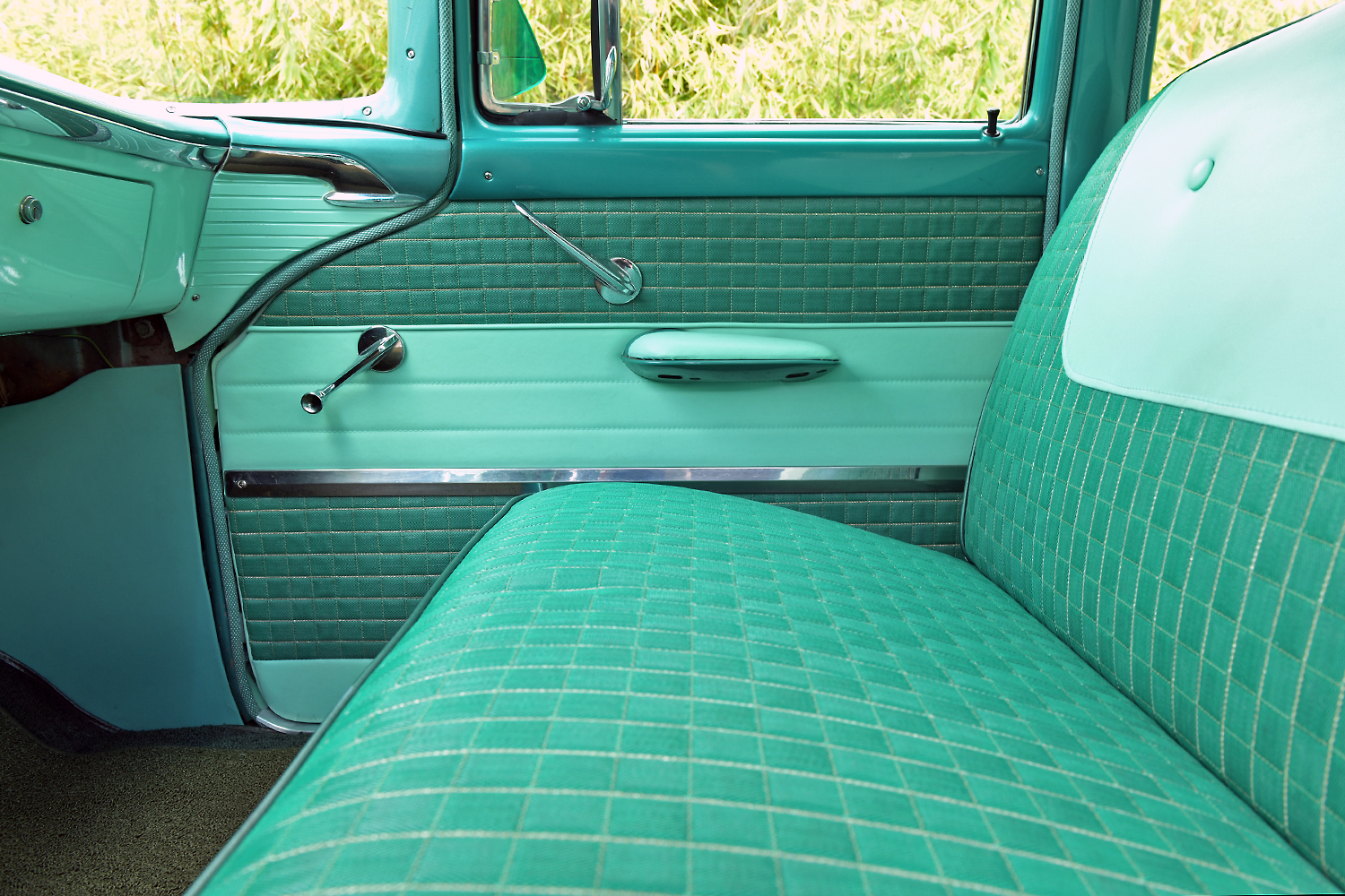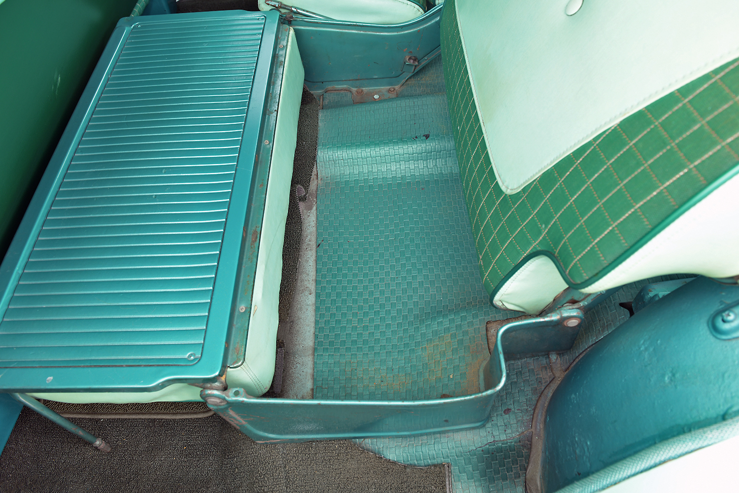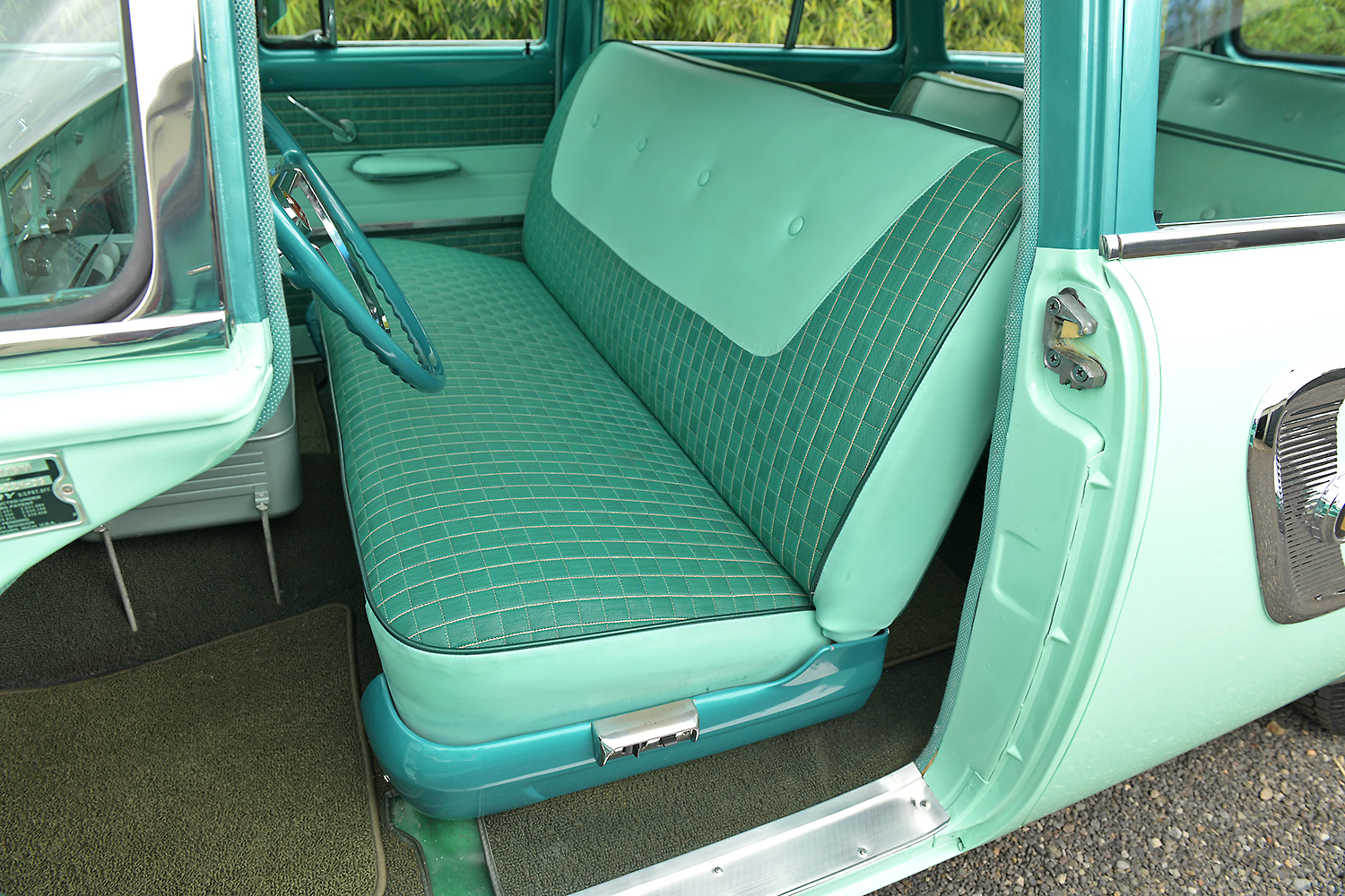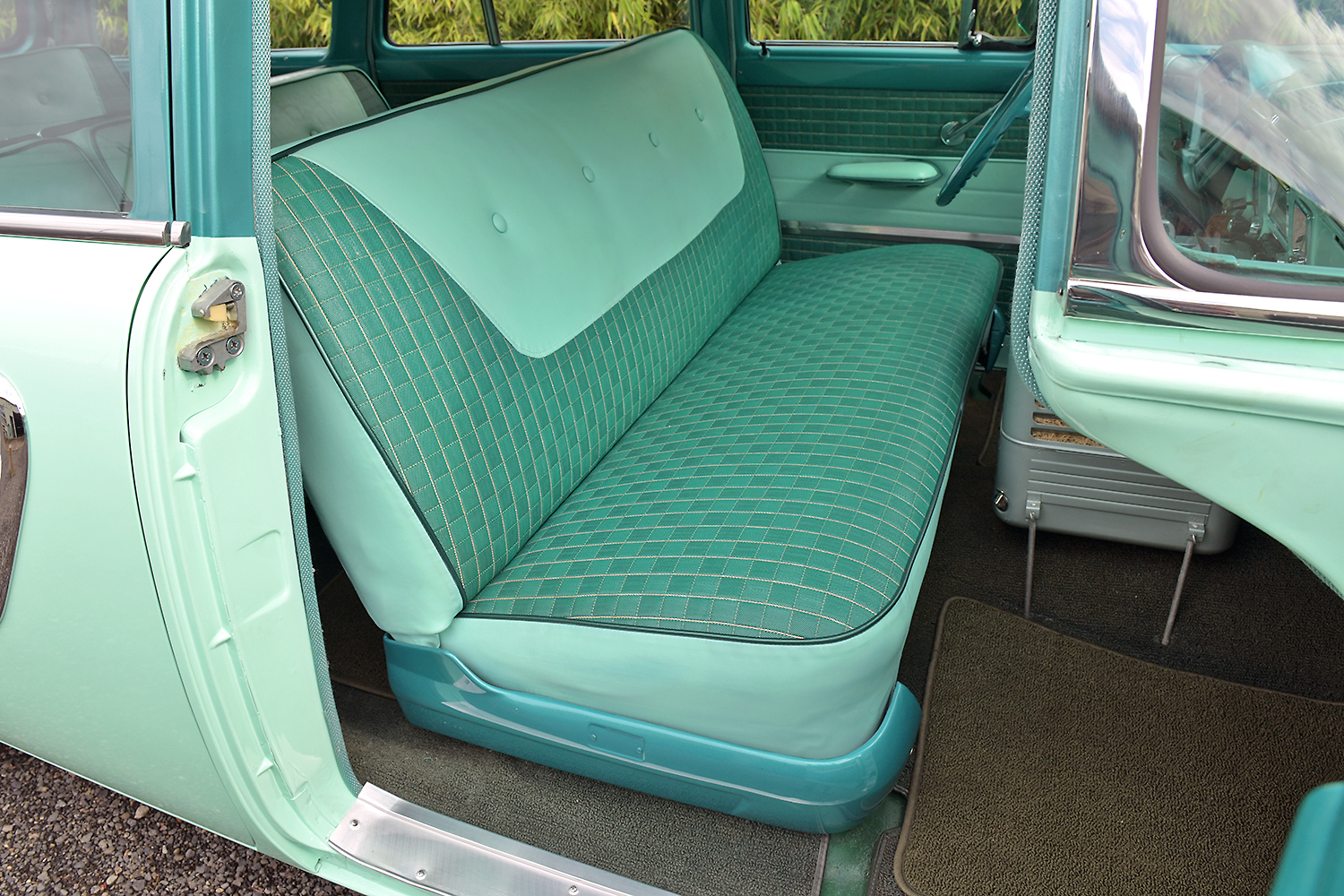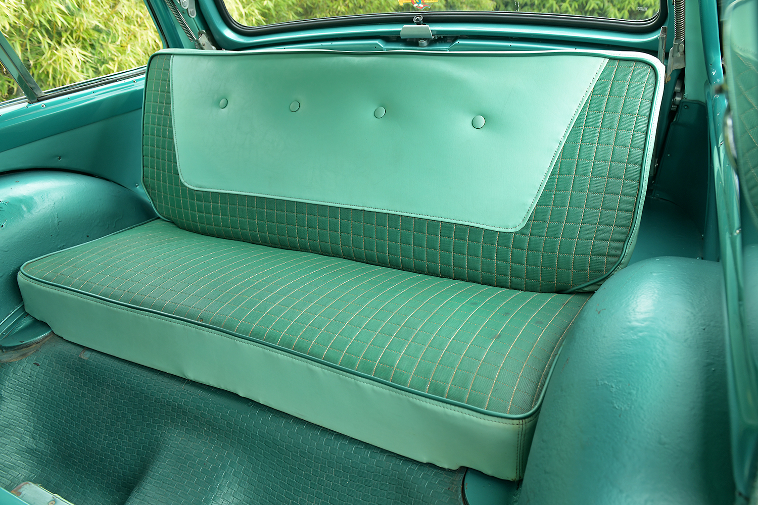 The interior is done in "Green Square Chromatex". The front seat was redone using NOS materials, the remainder is original.