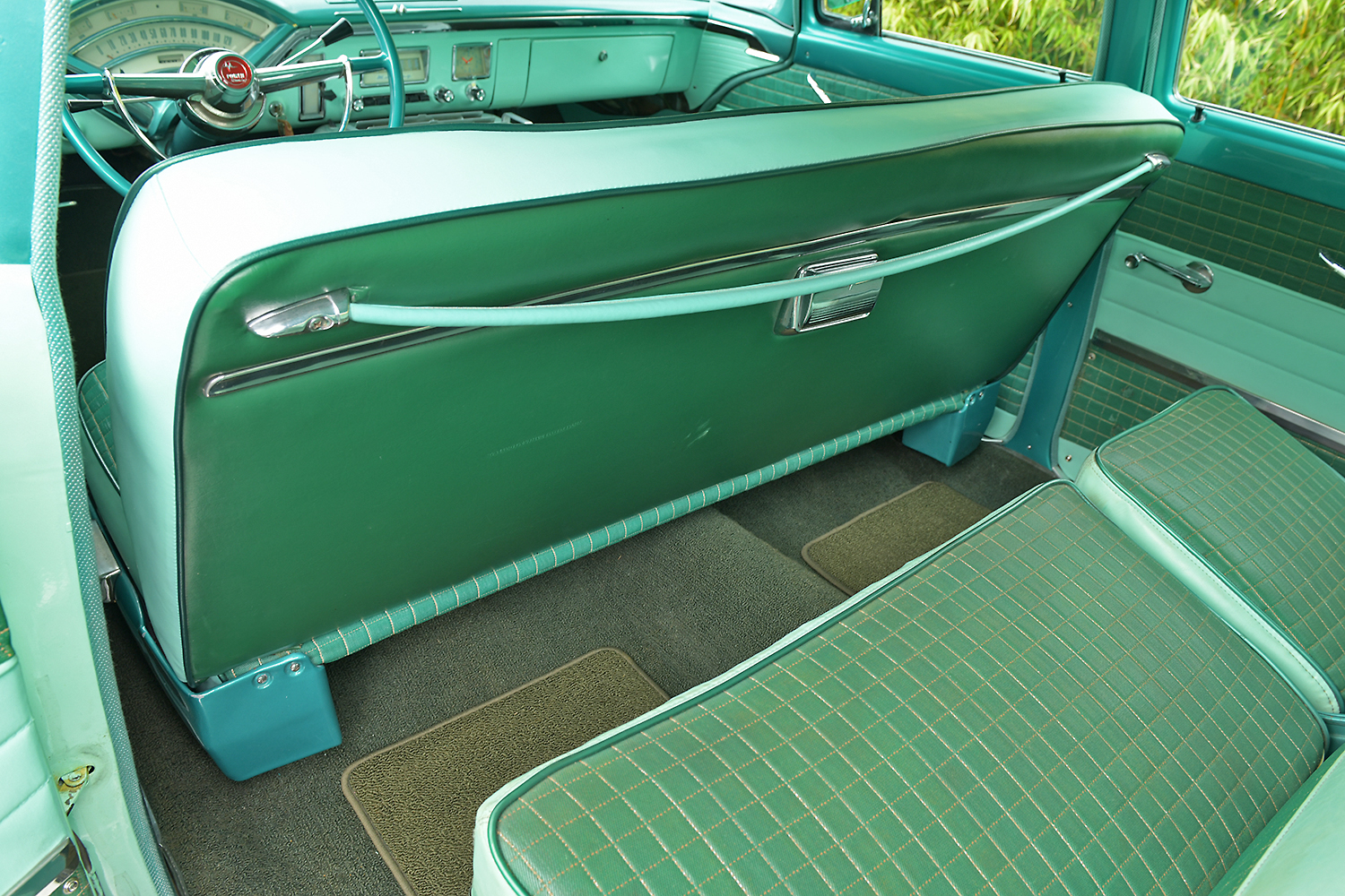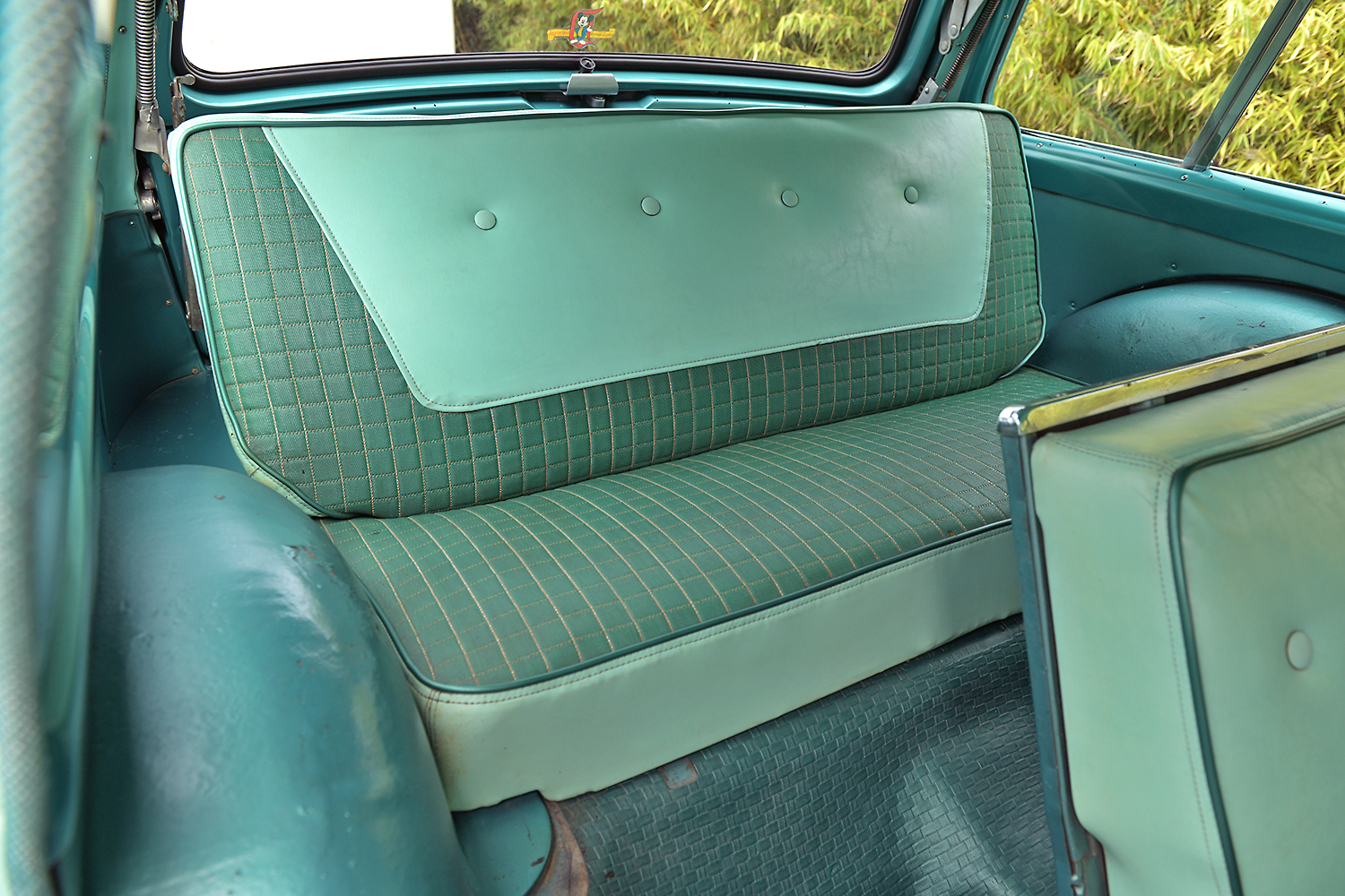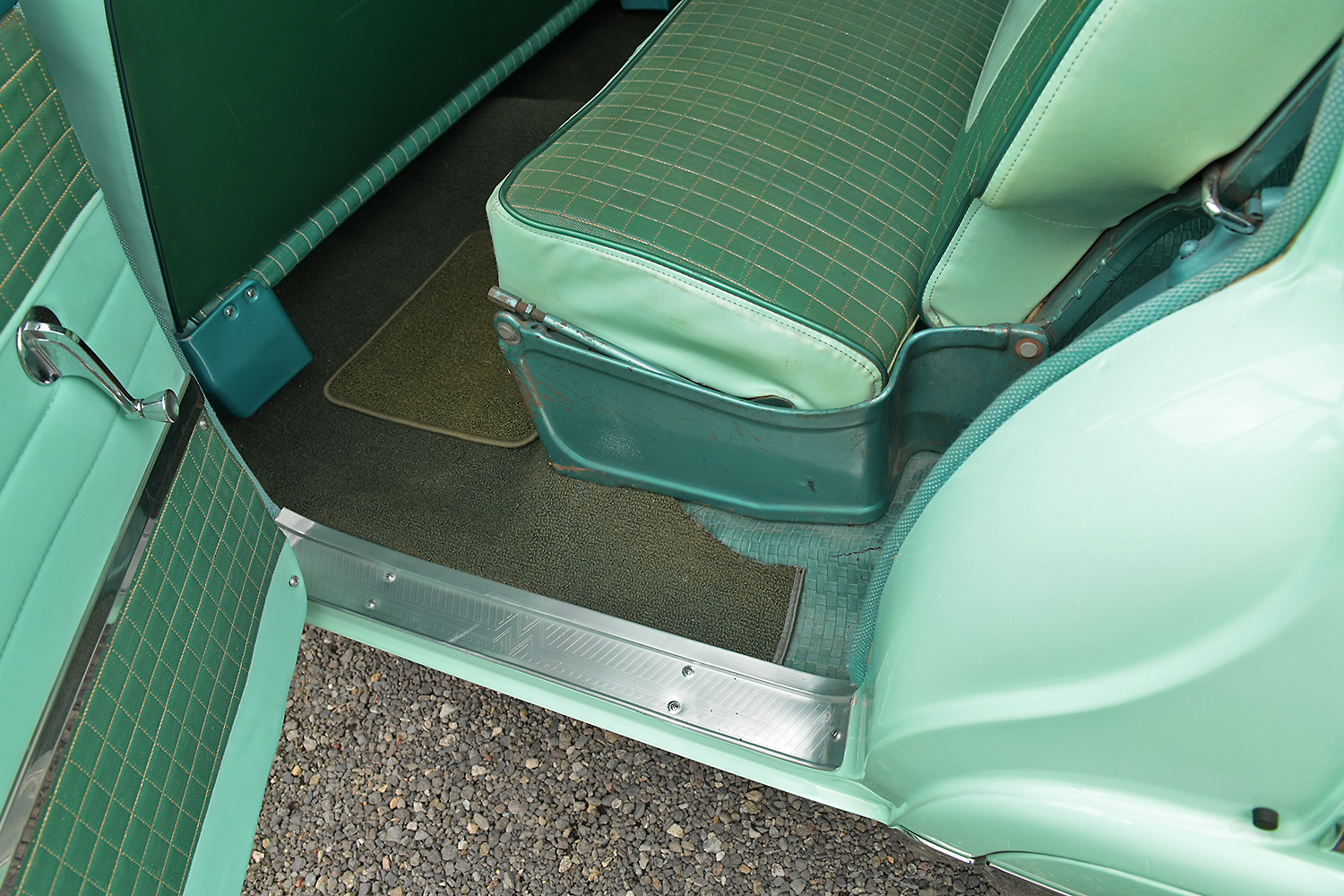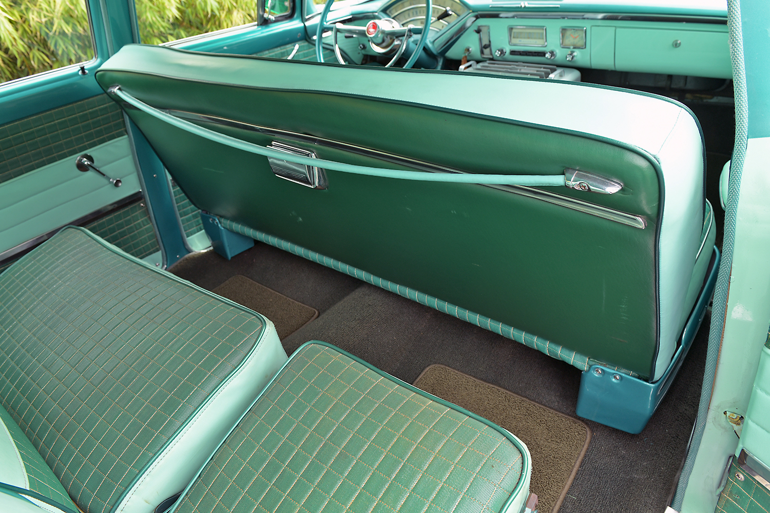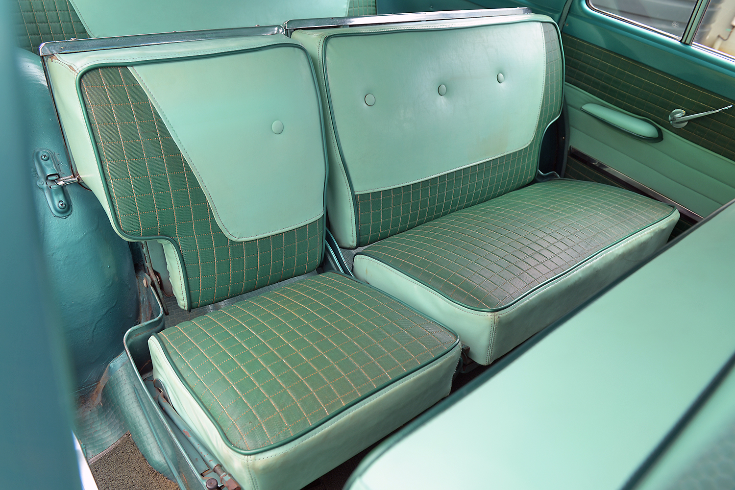 The interior is done in "Green Square Chromatex". The front seat was redone using NOS materials, the remainder is original.