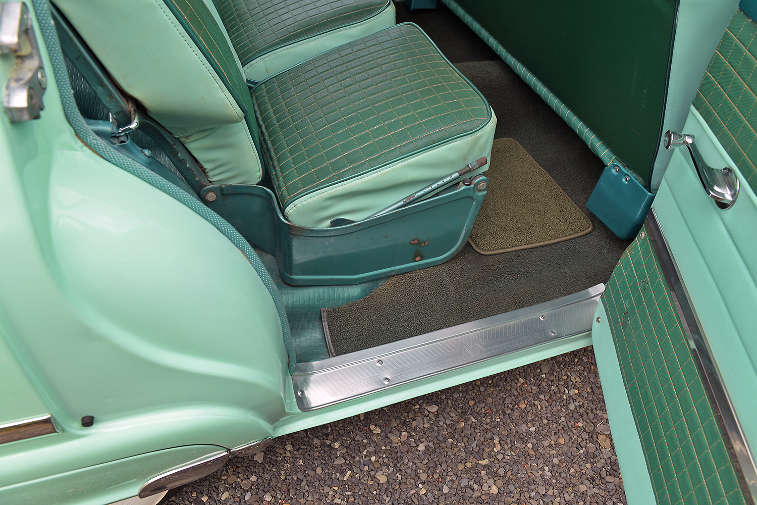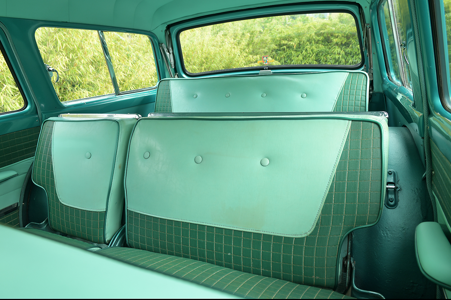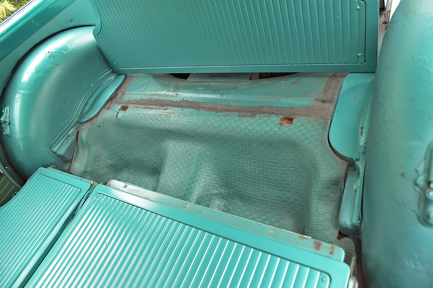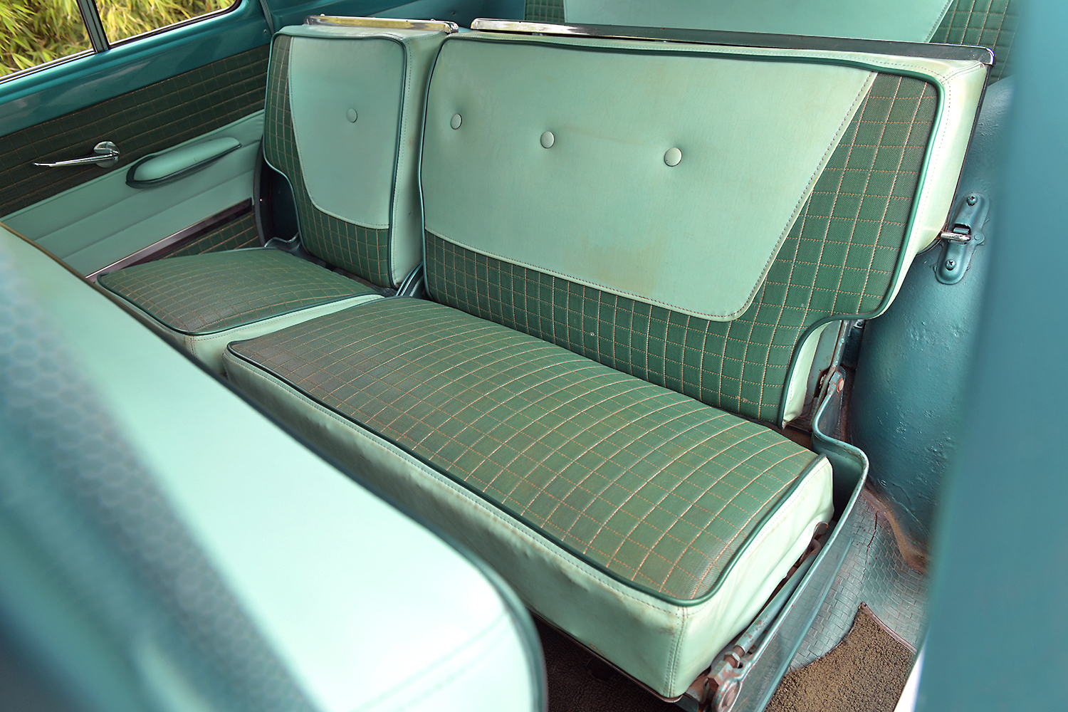 The interior is done in "Green Square Chromatex". The front seat was redone using NOS materials, the remainder is original.